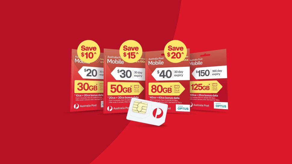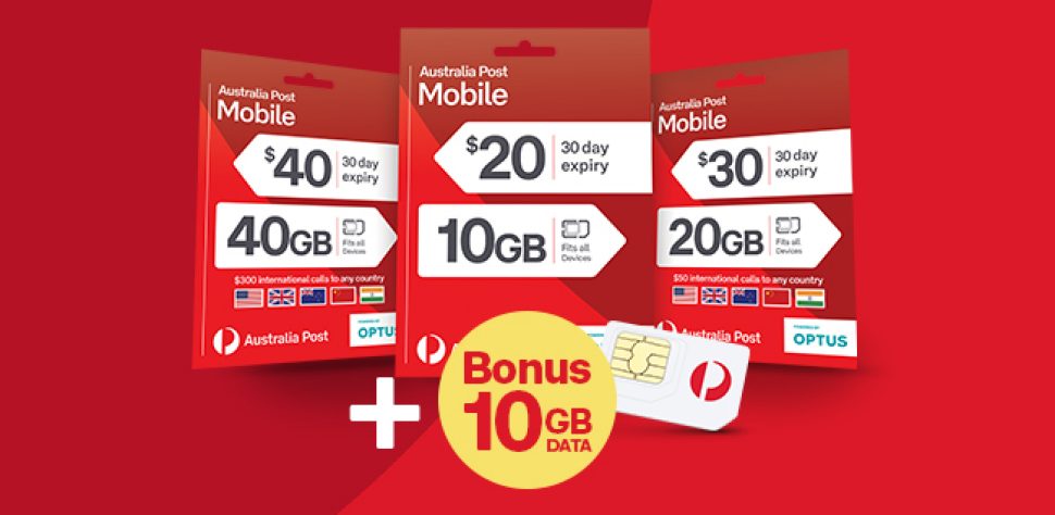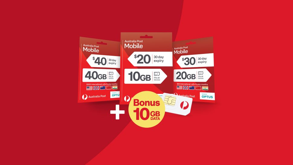 1 Discount offer applies to new customers initial renewal of a $20, $30 and $40 SIM purchases only. Discount offer ends 28 November 2021. New customers get 20GB bonus data (with $20 SIM), 30GB bonus data (with $30 SIM) and 40GB bonus data (with $40 SIM) on first three renewals when you activate an Australia Post Mobile (AP Mobile) SIM Starter Pack on a 30-day plan (including first renewal with activation). Activation and first renewal to receive bonus data must occur between 1 November 2021 and 9 January 2022, remaining two renewals by 10 March 2022.