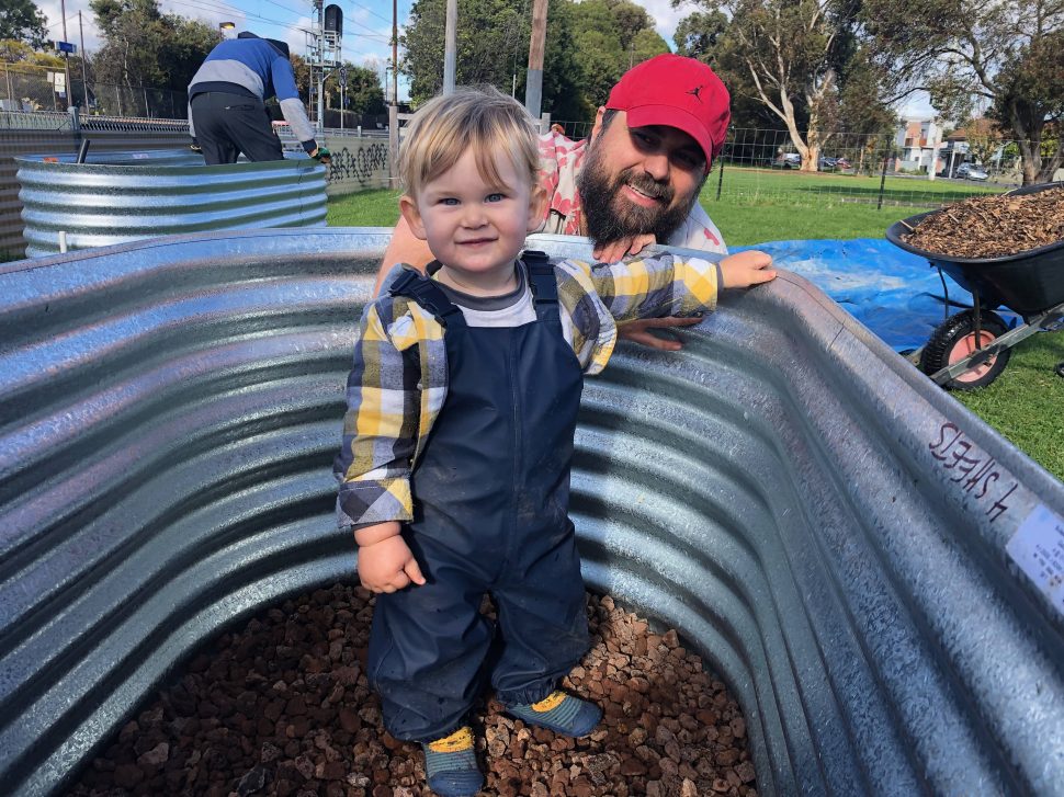 Australia Post Team Member, Adam Clifford, with his son, helping to flatten the gravel in the grant funded garden bed.