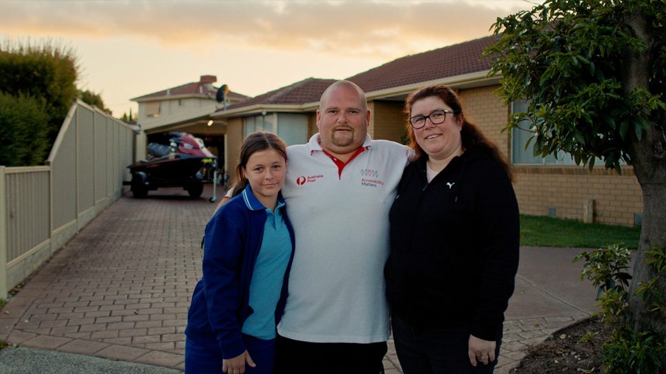 Today, Michael’s uniform is an Australia Post polo shirt and black shorts. The back of his uniform shirt features an Accessibility Matters logo.