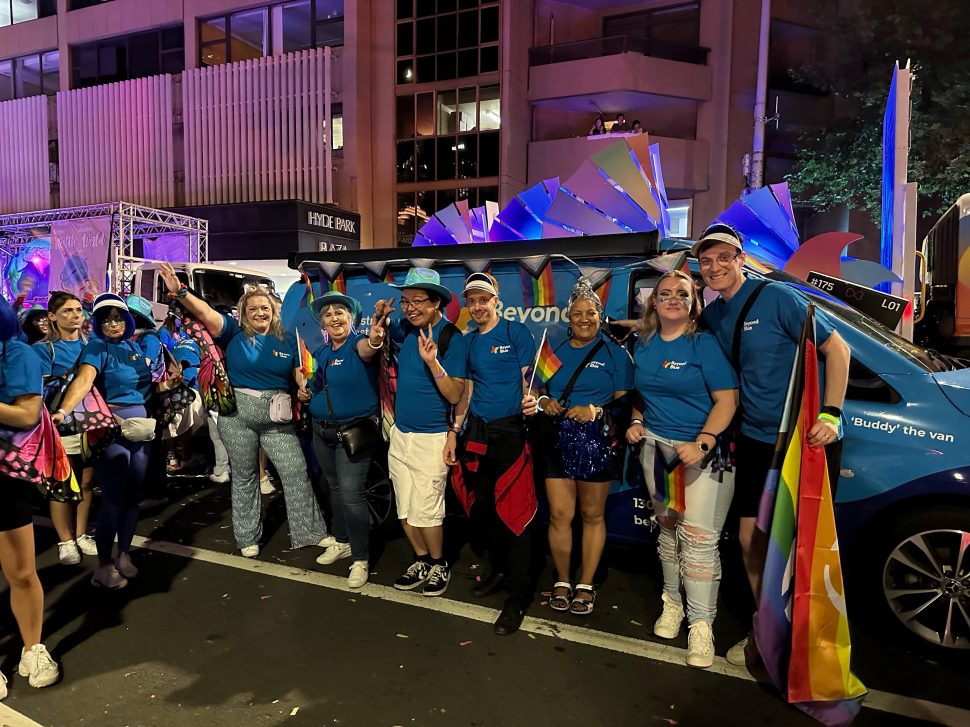 At the Parade, Mark and other PostPride members joined Buddy, the iconic Beyond Blue community van sponsored by Australia Post, and more than 60 volunteers dancing their way along Oxford Street as part of the Beyond Blue float.