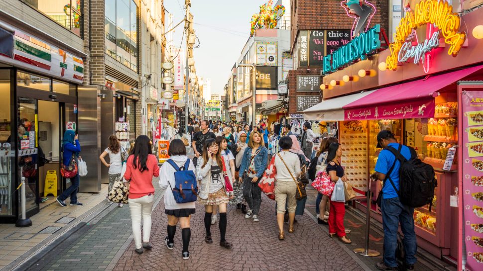 Cut to a close up of a person on the street, standing outside one of the buildings, playing with a colourful spin-top toy. This shot cross fades into the next of a busy city street at night time. A man walks down a street in front of the camera with countless brightly coloured signs and shops to either side.