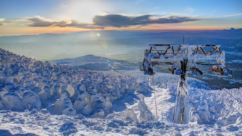 Fade in from black, a wide panning shot of scenic snow covered mountains and trees in the foreground. As the sun peaks just above one of the mountain tops, the title ‘Japan with Chloe Ting’ appears in the top centre of the screen.